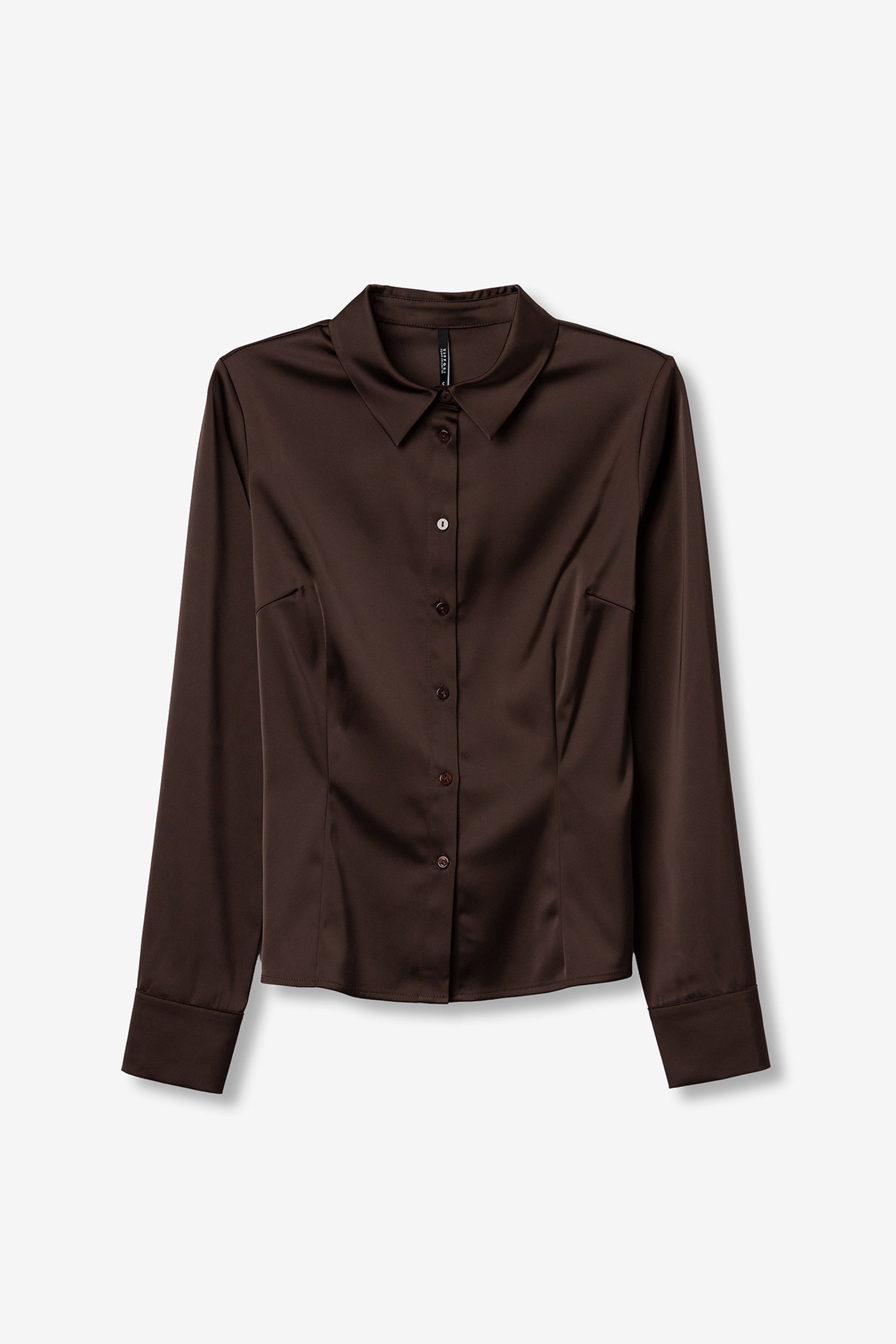 Camisa marrón chocolate de manga larga, corte slim, con botones frontales y cuello clásico elegante.