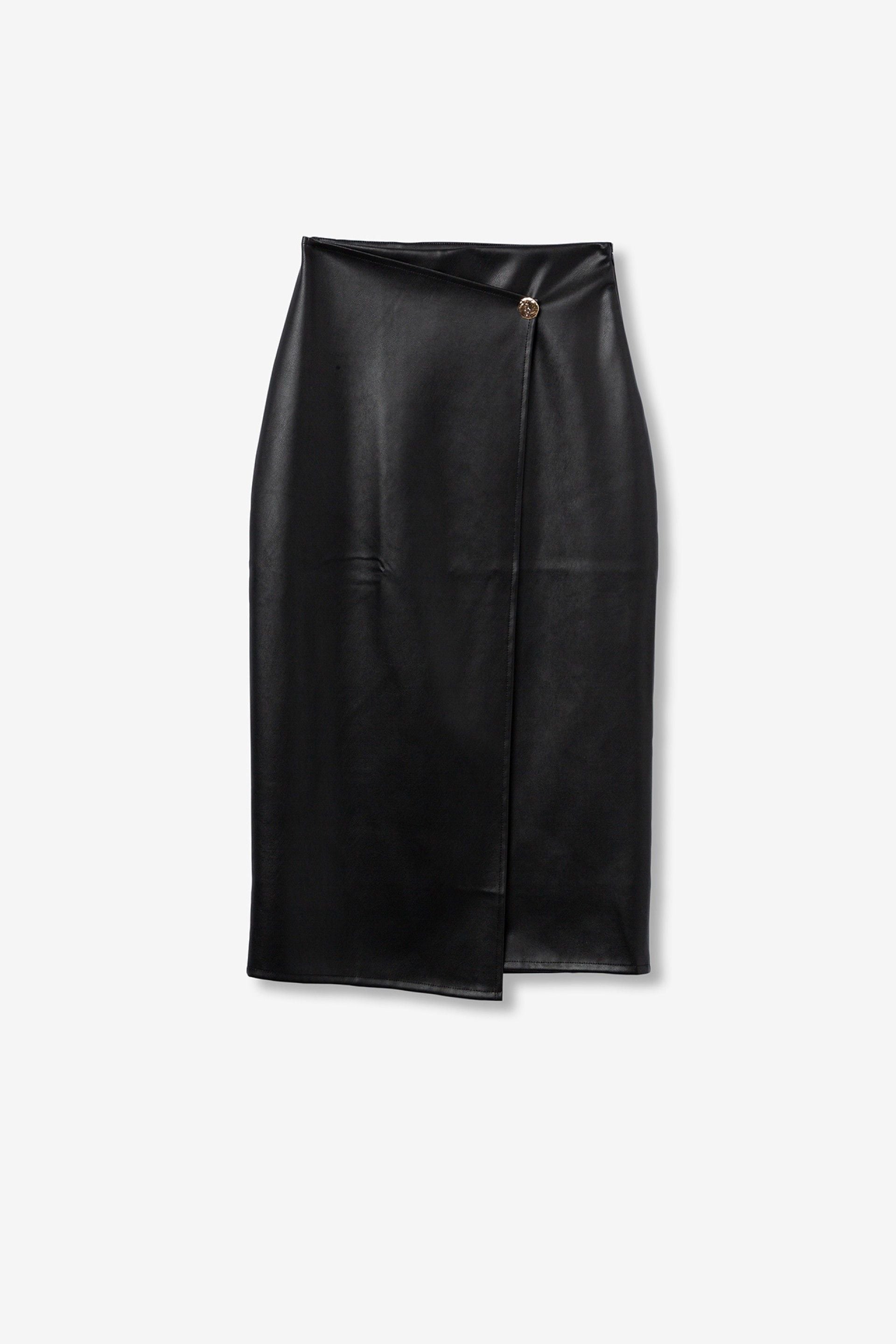 Falda midi negra efecto piel, con diseño cruzado y detalle de botón metálico. Un básico sofisticado para elevar tus looks de día y de noche.