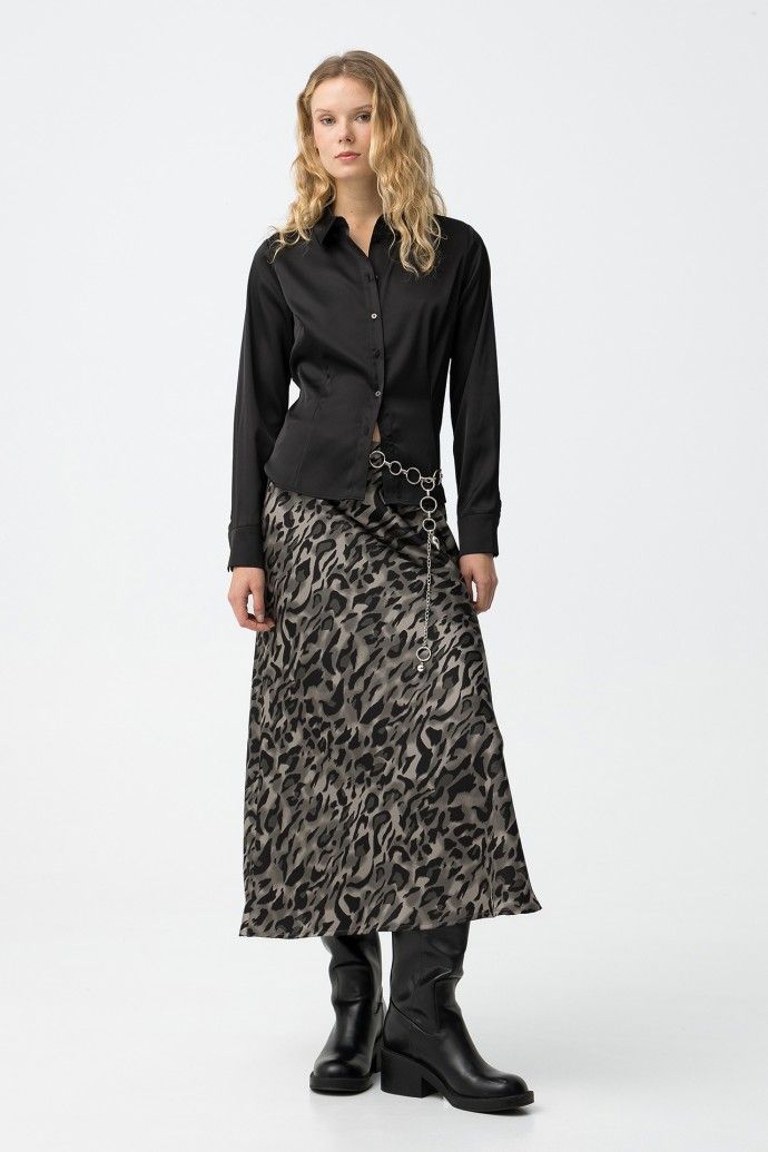 Falda midi de corte regular con estampado animal en tonos gris claro y negro.