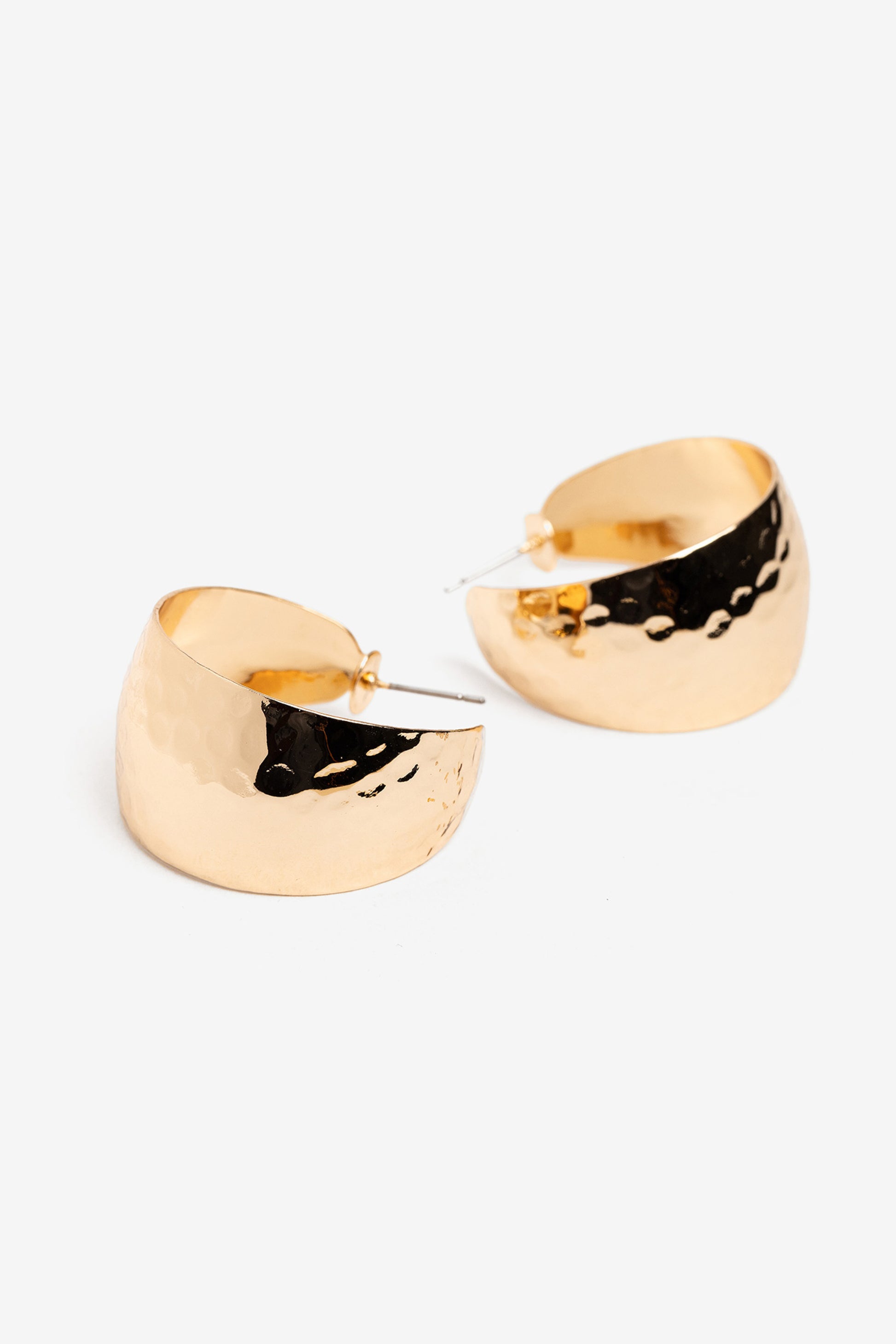 Pendientes de aro dorados con textura martillada y cierre de tuerca discreto, estilo moderno